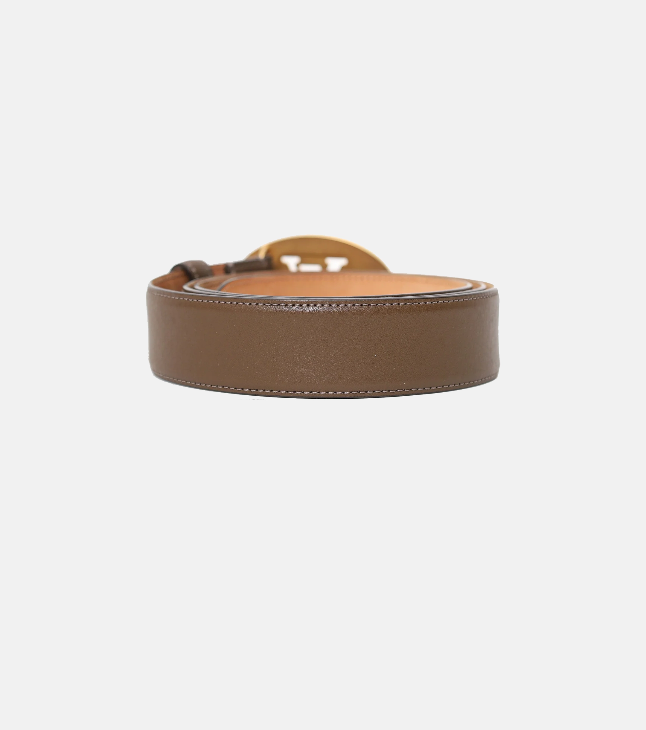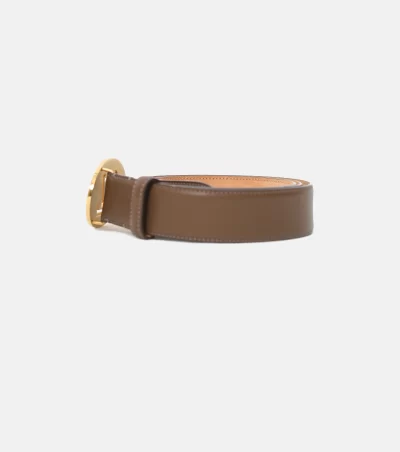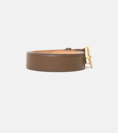 Louis Vuitton Taupe Leather/GHW ‘LV’ Buckle Belt. Adjustable pull-through push-pin closure. Gold-tone hardware. Tonal stitching.