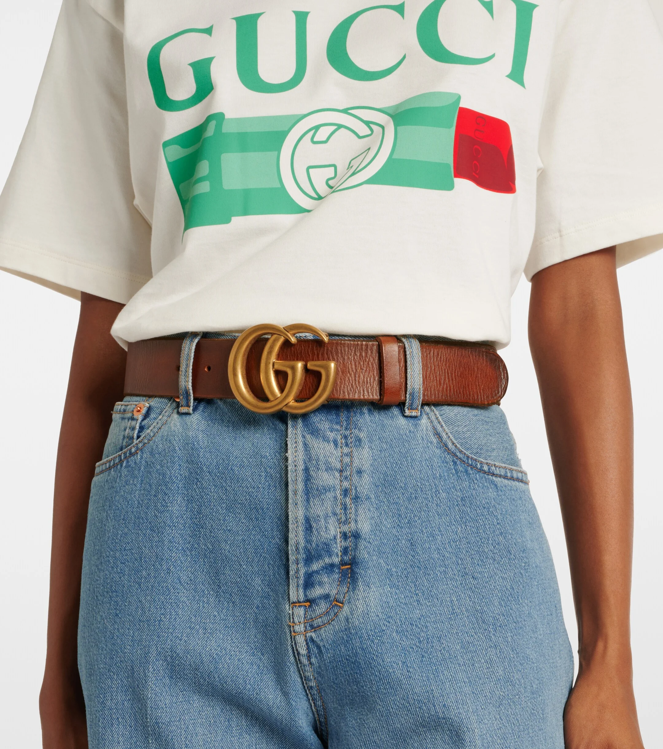 Finish your outfits on a sophisticated note with this smooth leather belt from Gucci. Cementing its luxury status with the signature GG buckle, this piece shines with an antique gold-toned finish. Style it with anything from denim to a luxe, languid silk skirt.